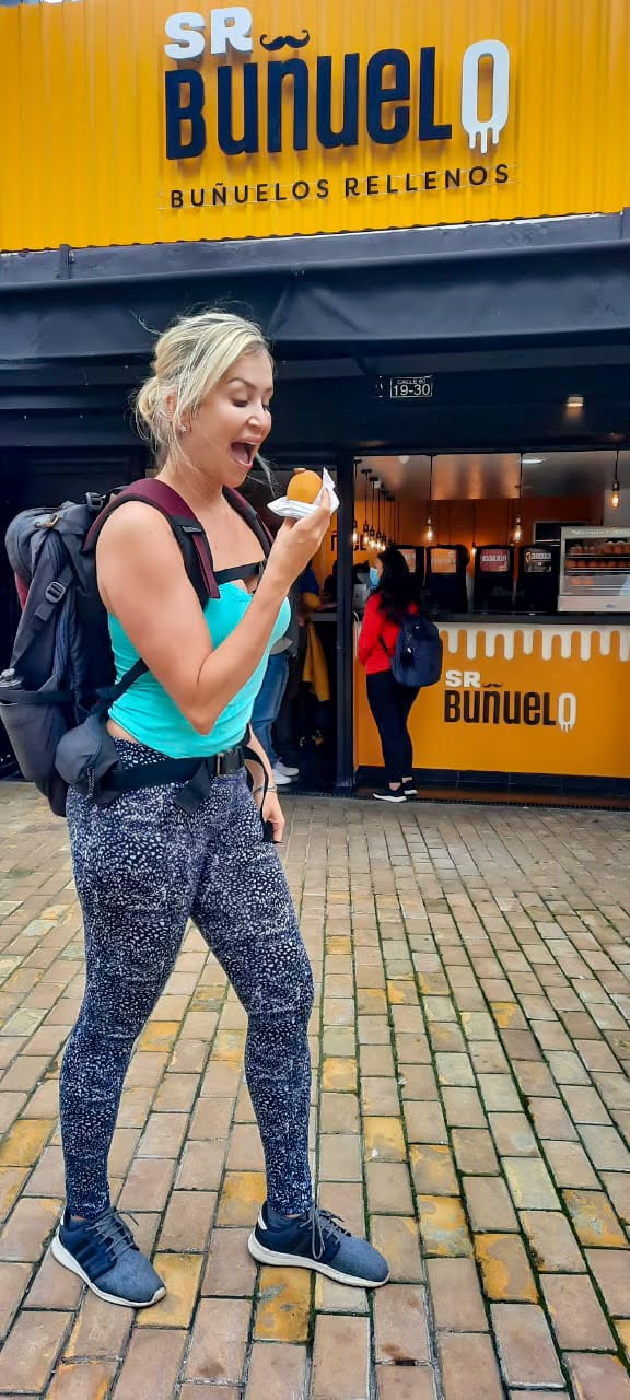 Me deliciando com um Buñuelo recheado com Arequipe (doce de leite) na Zona Rosa