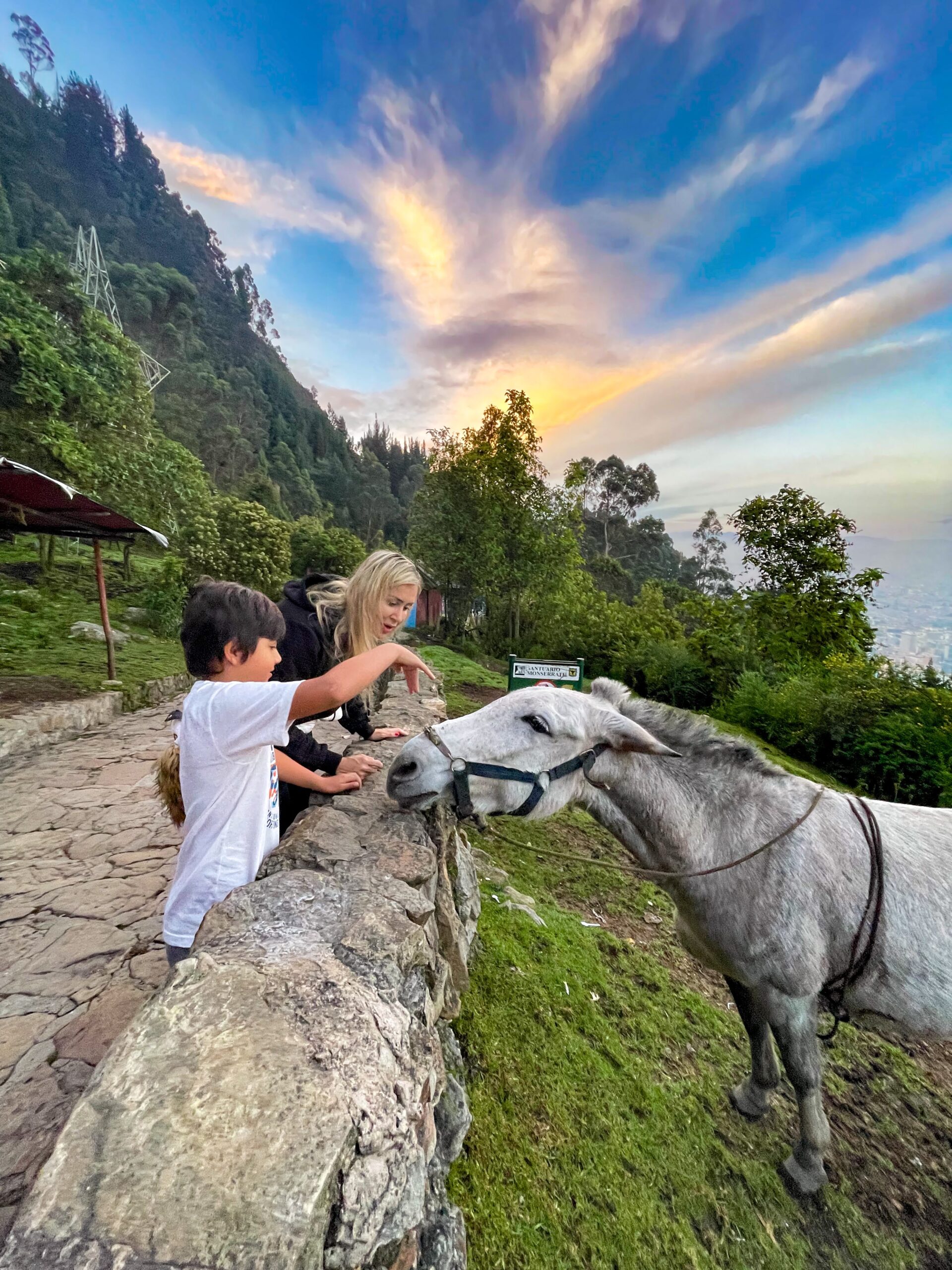 No caminho você encontra sítios que criam lhamas🦙 e burros 🐴 e vê a cidade incrível que Bogotá é, misturando o moderno ao campo em plena capital! Quanto mais se sobe, mais a vista fica fantástica e a benção de ter um dia bonito nos foi dada. Tons de rosa e azul de presente 🎁!